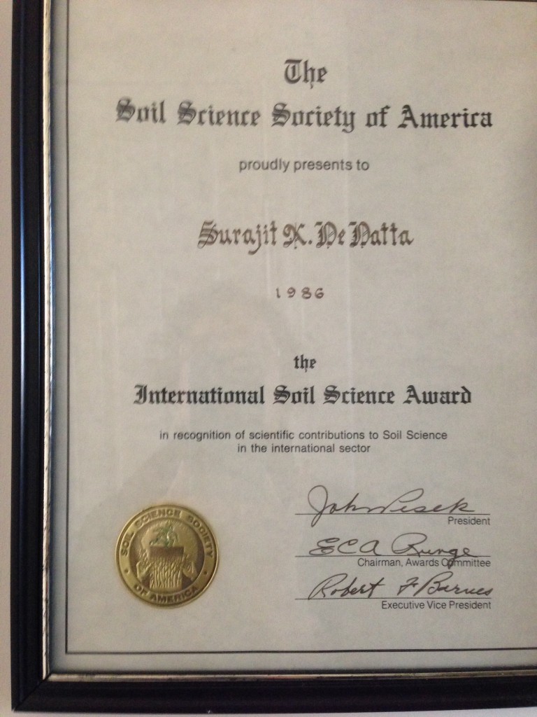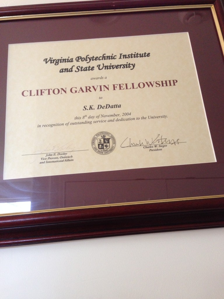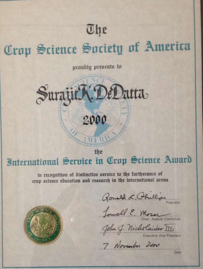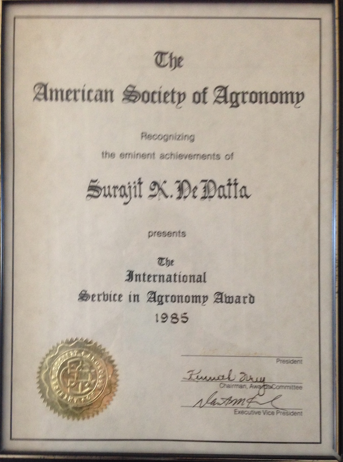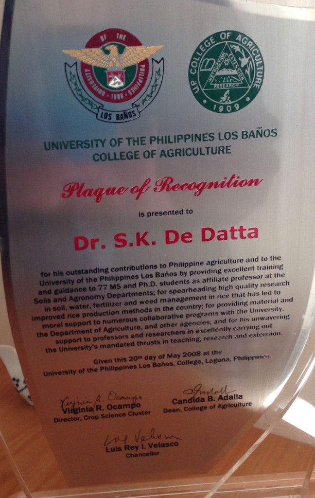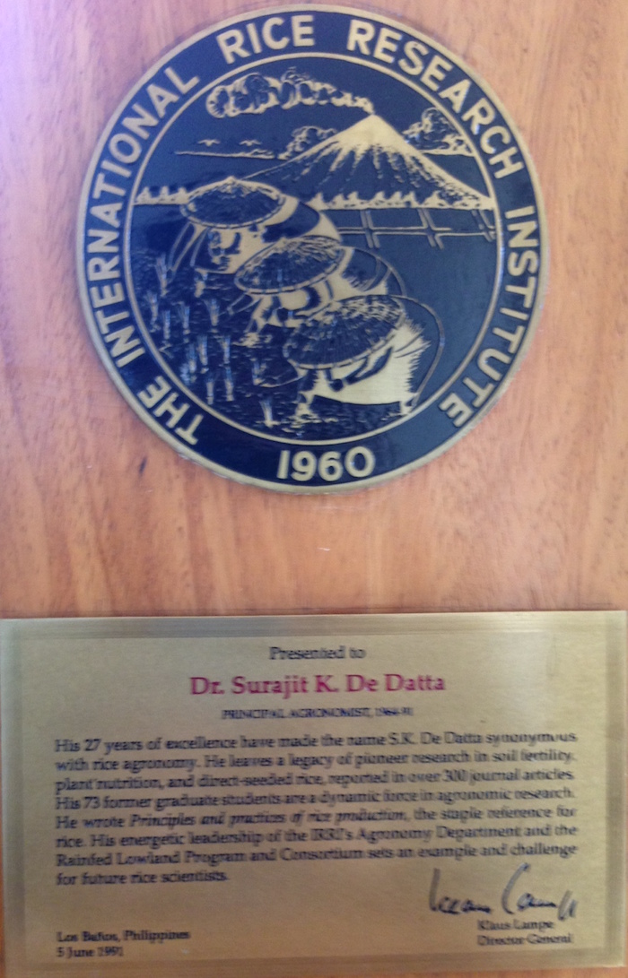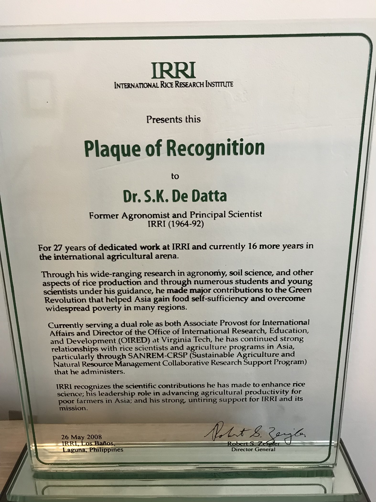After 27 years at IRRI, when S.K. De Datta left IRRI to join Virginia Tech in USA, IRRI presented this plaque as a recognition of S.K.’s long years of services to IRRI and the riceworld.