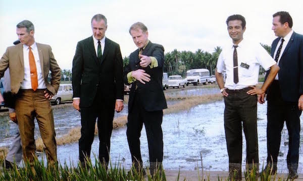 US Vice President Spiro Agnew visiting IRRI. Dr. Chandler (the first Director of IRRI) explaining the research of Dr. S.K. De Datta to the Vice President Agnew, secret service personnel look on.